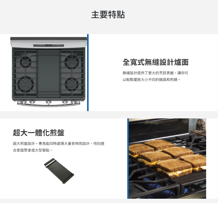 GE奇異 JGBS66DEKWW 30吋瓦斯型四口單層爐連烤