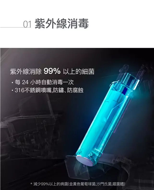 UV除菌:透過紫外線進行除菌,可有效去除99%的細菌,確保噴管清潔