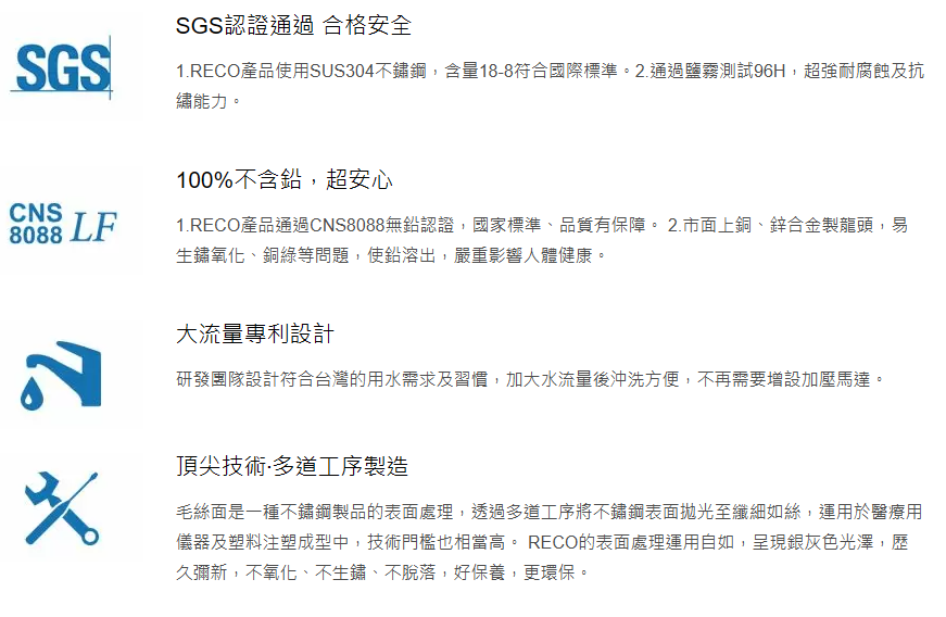 RECO不鏽鋼SUS304淋浴龍頭,含18-8成分達國際標準,通過國家標準CNS 8088、美國UPC、加拿大CUPC無鉛認證。重要零件陶瓷閥芯、起泡器獲NSF、ACS認證,耐用測試100萬次不損壞。全新不鏽鋼製,堅固耐用,極佳抗腐蝕,外觀優雅,易於清潔保養。